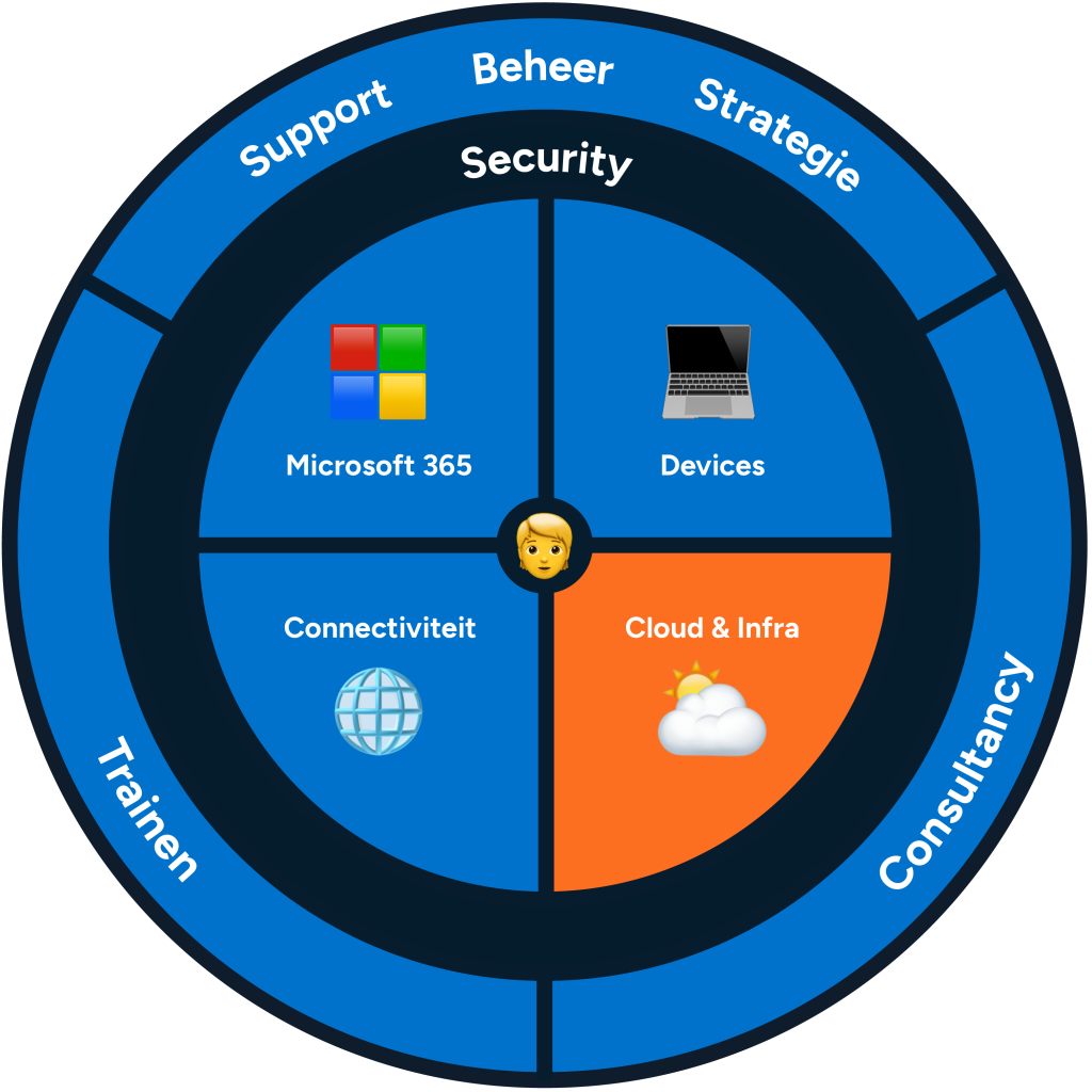 In addition to a good setup of your business cloud environment, it is also important that your physical business network is well connected. In this case, it is the small things that make the difference. And we simply arrange that for you. No cables dangling under the desks thanks to our cable management WiFi that works in the reception area, canteen and at the workplaces A guest WiFi network via managed WiFi management. Enough switches to provide each device with wired internet Fine Bluetooth keyboards, mice and other IT accessories